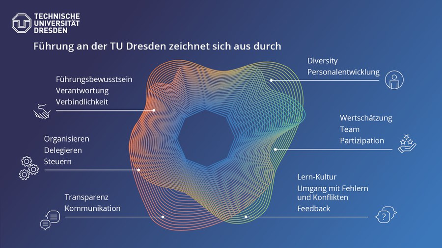 Die Führungsleitlinien der TU Dresden basieren auf unseren Werten Partizipation, Transparenz, Wertschätzung, Redlichkeit und kreative Innovationsfreude und bilden das gemeinsame Führungsverständnis der TU Dresden ab. Sie wurden im Rahmen des Führungskulturprojekts, welches im Handlungsfeld "Spirit" des Exzellenzprogramms angesiedelt ist, in einem partizipativen Prozess mit Führungskräften sowie Beschäftigten aus Academia, Technik und Verwaltung der TU Dresden erarbeitet und sollen allen Beschäftigten einen verlässlichen Orientierungsrahmen bieten.